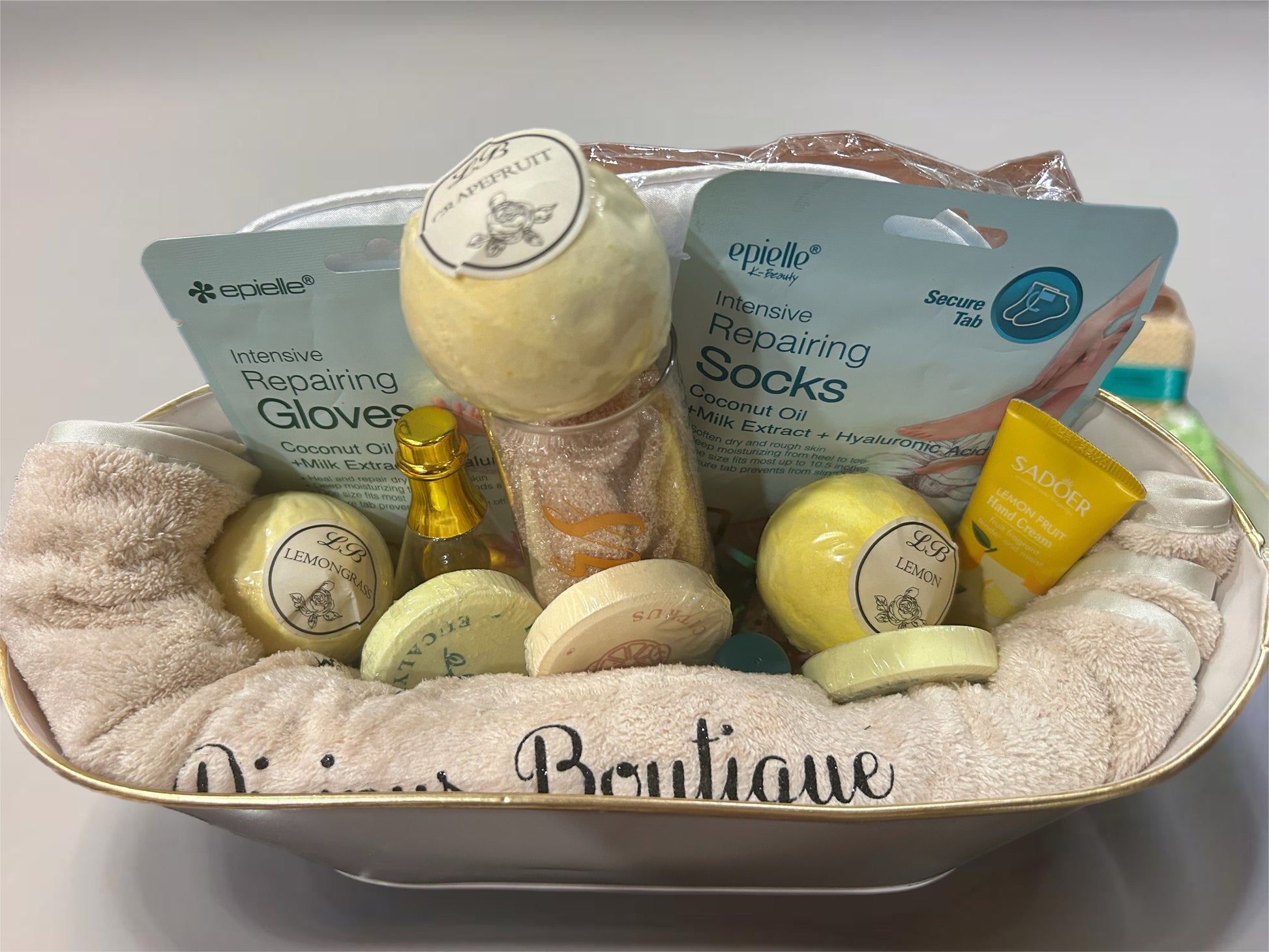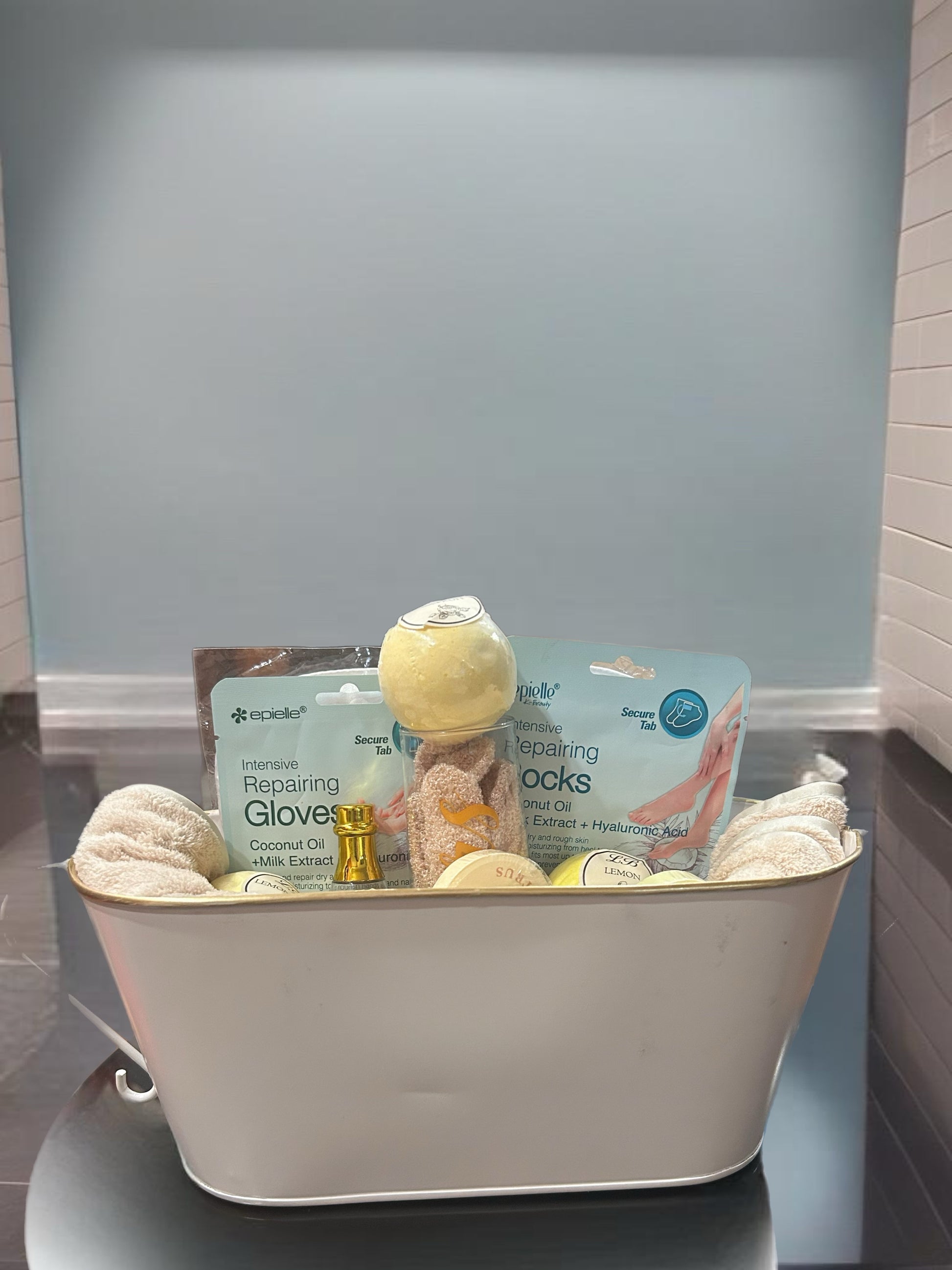Our Cream Run Basket is a delightful collection of soothing spa products in sunny yellow hues. It is filled with luxurious yellow-themed items to elevate your relaxation experience. It is a perfect blend of elegance and rejuvenation, making it an ideal gift for yourself or a loved one seeking sunshine and serenity in their self-care routine.