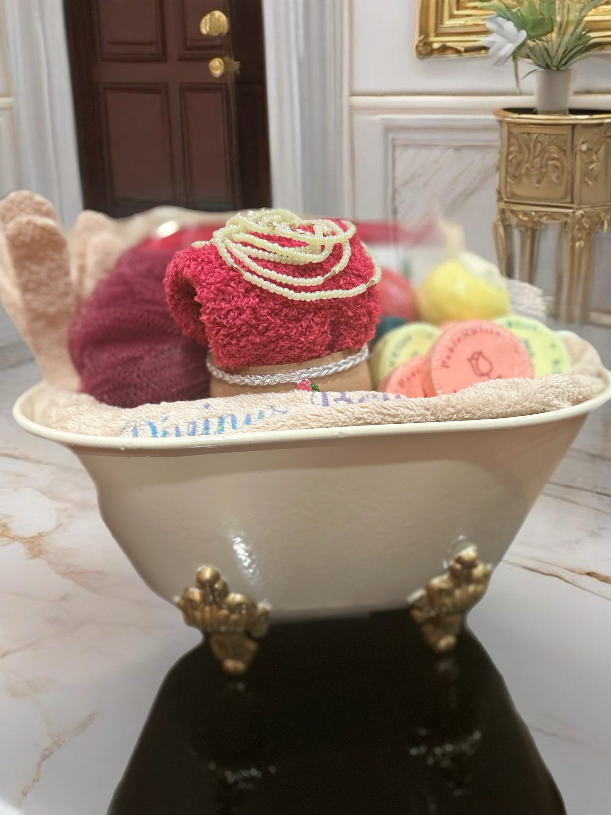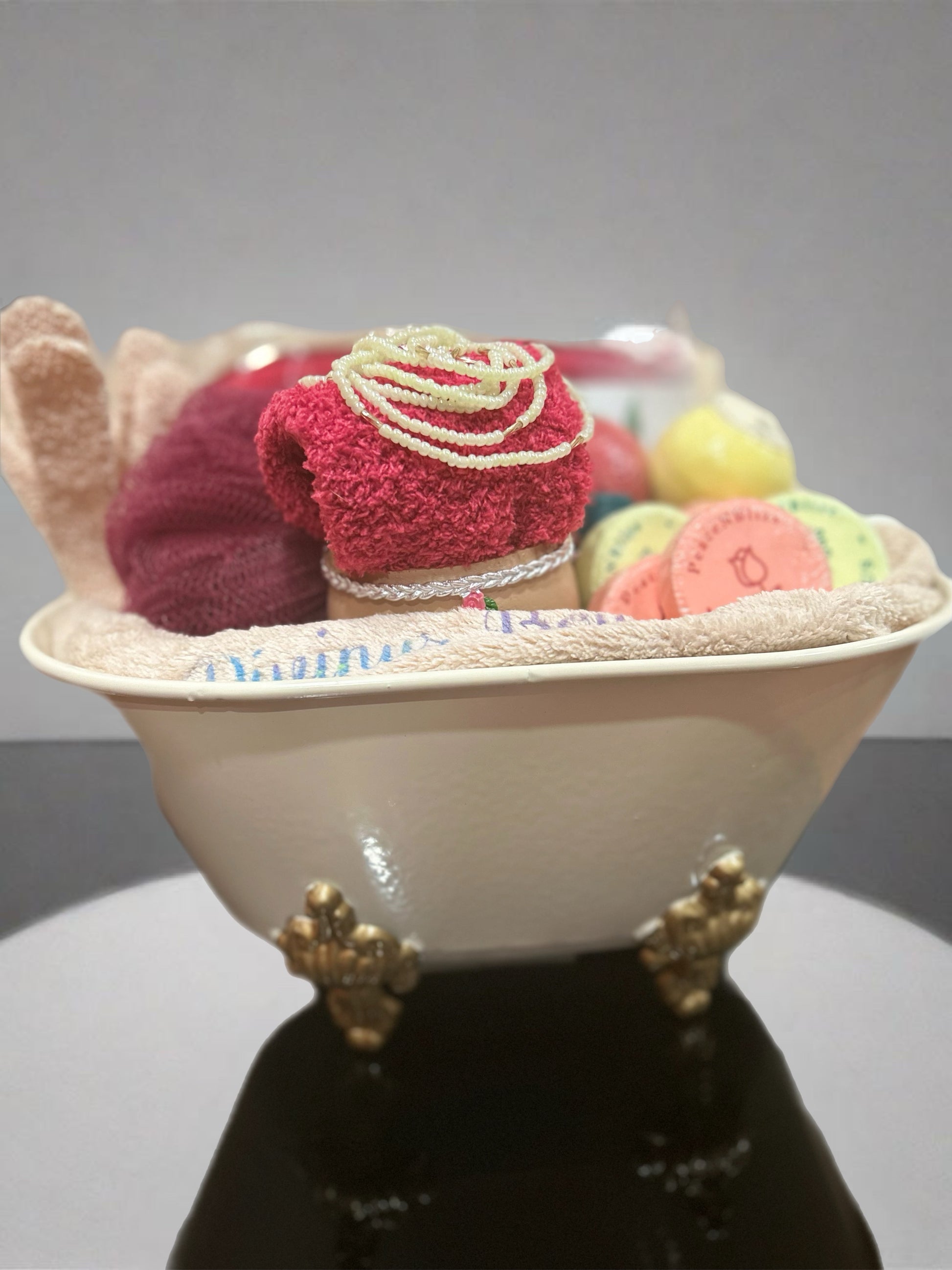 Imagine a charming vintage crowfoot tub gift basket that's all about rejuvenating and welcoming the vibrant energy of spring! This delightful bundle is curated to enhance your self-care routine, featuring a plush hand towel, shower steamers, bath bombs, exfoliating gloves, complimentary waist beads that add a touch of elegance, and a personalized sleep mask for the ultimate relaxation. a face flower pot to plant your favorite springtime flowers and so much more. Each item is thoughtfully selected to evoke the freshness of the season, ensuring your bath time is not just a routine but a luxurious escape.