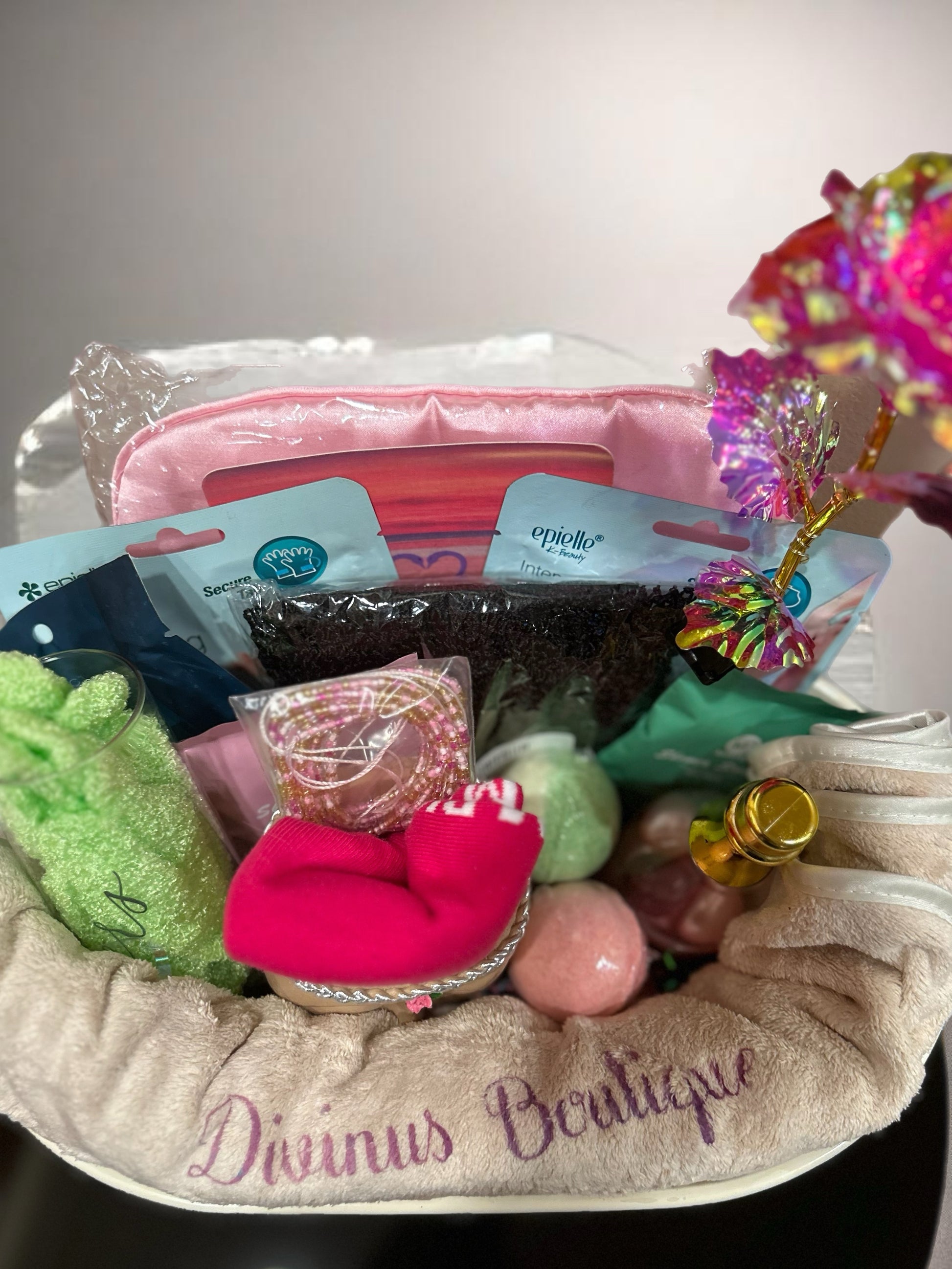 A charming vintage crowfoot tub gift basket that's all about rejuvenating and welcoming the vibrant energy of spring! This delightful bundle is curated to enhance your self-care routine, featuring a plush hand towel, complimentary waist beads that add a touch of elegance, exfoliating gloves, a champagne flute, feet and hand mask, a rose that lights up, a face planter, bath oil beads, bath salt, and a personalized sleep mask for the ultimate relaxation. Each item is thoughtfully selected to evoke the freshness of the season, ensuring your bath time is not just a routine but a luxurious escape.